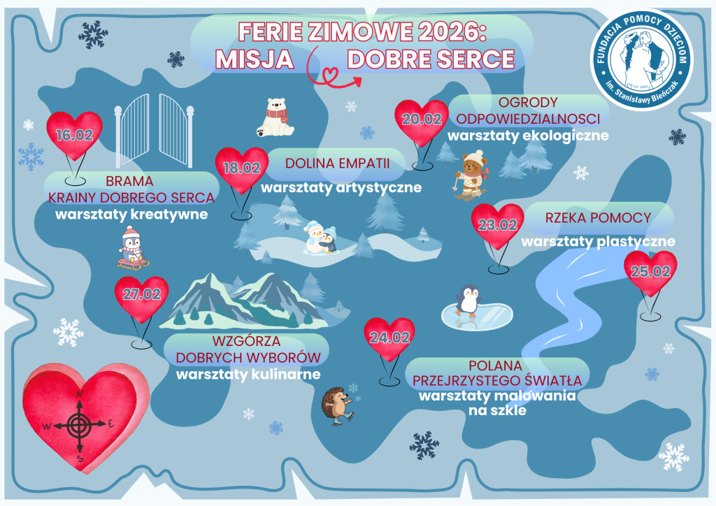 Zapraszamy dzieci w wieku 7-12 lat na wyjątkową podróż do Krainy Dobrego Serca – miejsca, w którym uczymy się dobra, empatii i realnego pomagania.